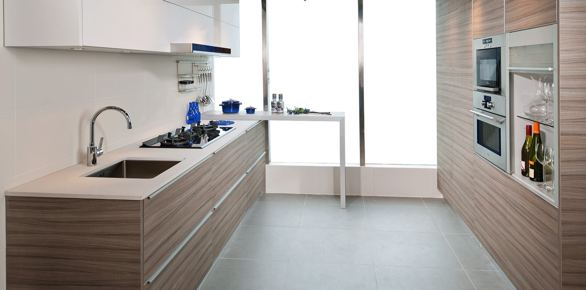Flowing horizontal lines invite creative use of the ample storage space within. Light colored wall cabinets add a sense of balance.
