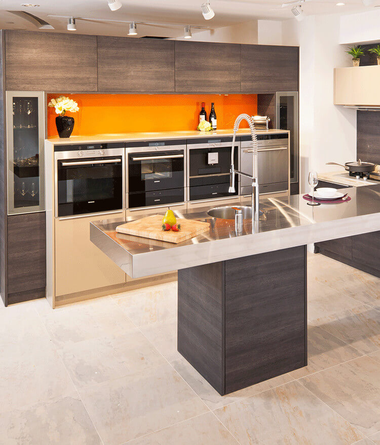 Varied cabinet and worktop dimensions and striking materials create an aesthetically appealing visual landscape.
