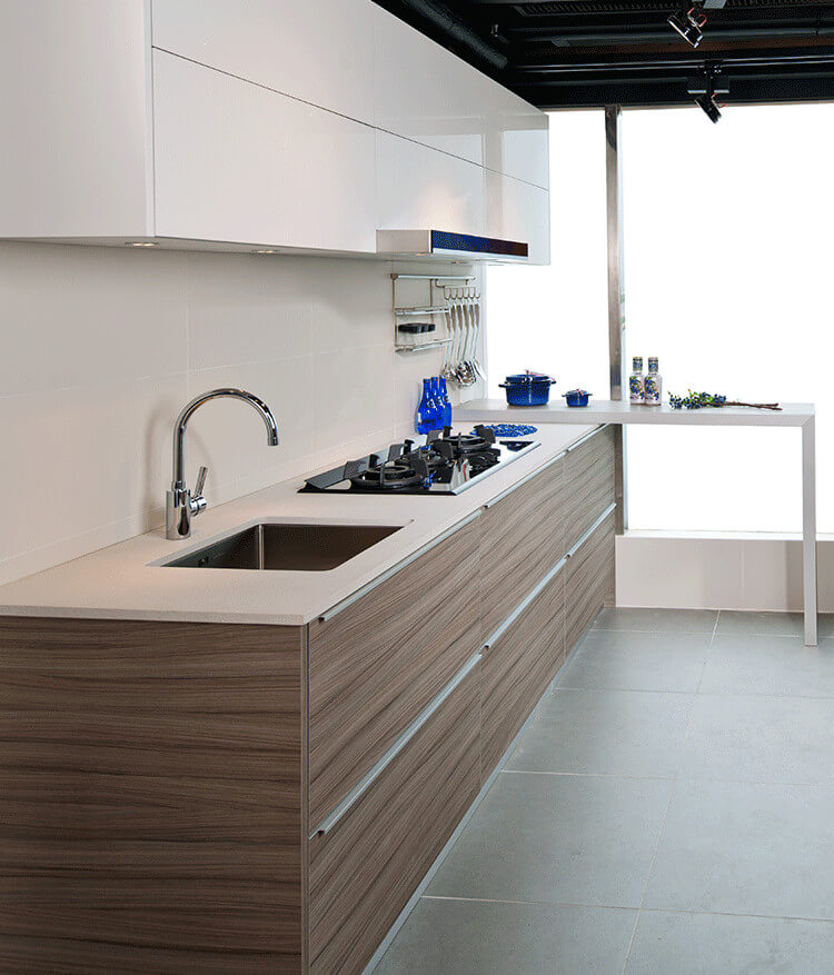 Flowing horizontal lines invite creative use of the ample storage space within. Light colored wall cabinets add a sense of balance.