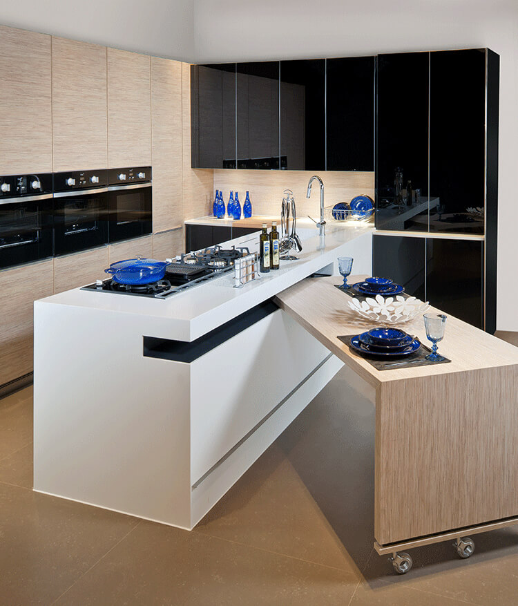 一按即開的無門柄櫃門,令廚櫃設計更顯流麗雅緻。