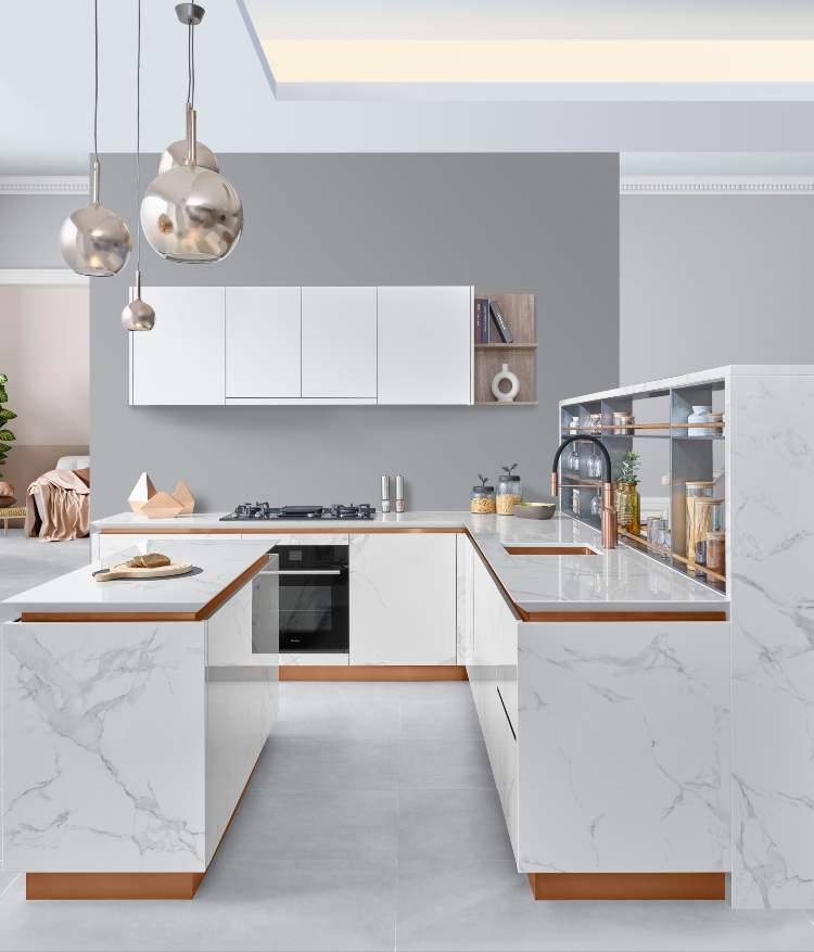Mia Cucina 將暗灰紋理的白色陶瓷石物料應用在工作枱面和地櫃上,再配襯FENIX 納米技術啞光材質的吊櫃,顯得簡約俐落之餘,亦與周邊環境互相融合,勾勒出明亮舒適的感覺;廚櫃設計師在枱面沿邊加入玫瑰金作為點綴,亦透過同色系的鋅盤和擺設為廚房注入典雅格調,成為視覺焦點。