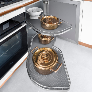 於角落位置加入轉角轉盤來充分利用隱藏空間,不僅能妥善收納較大的鍋具,其雙層設計亦使物品存放井然有序。