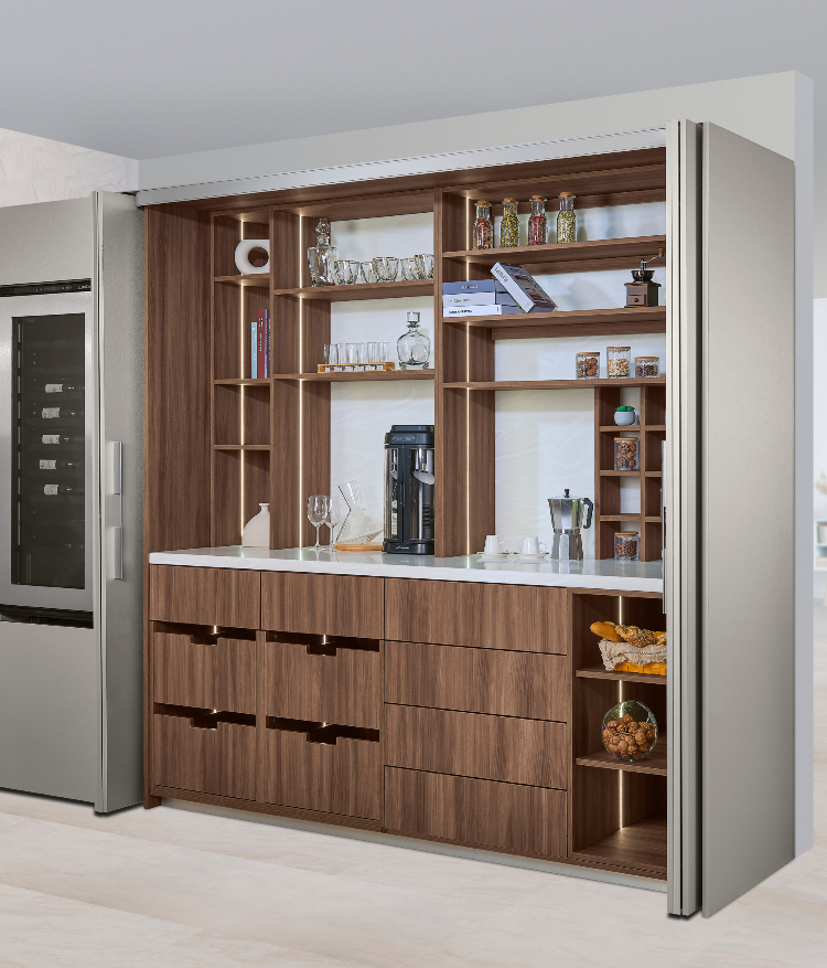 Mia Cucina將多年建造廚櫃項目的豐富經驗應用於其他櫃體,特意加入拉摺式櫃門系統來打造精緻實用家居。無論是在狹小的客廳還是廚房都能靈活善用空間,達到隱藏式的效果。