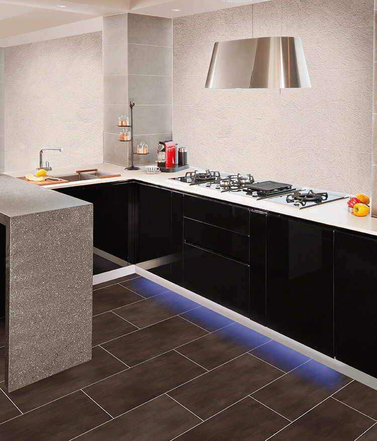 亮面亞加力飾板配合耀目的燈光佈置,為廚房空間注入現代格調。
